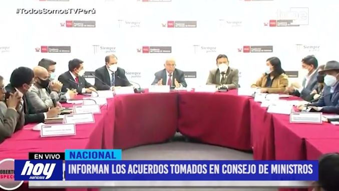 El premier Aníbal Torres junto a los ministros de las diferentes carteras ministeriales, brindaron una conferencia de prensa para informar los acuerdos tomados, como son la aprobación del proyecto de ley de la castración química para violadores, el aforo al 100% en instituciones educativas, el uso de la mascarilla de modo voluntario en las regiones que tengan el 80% de vacunados con la tercera dosis, entre otros.