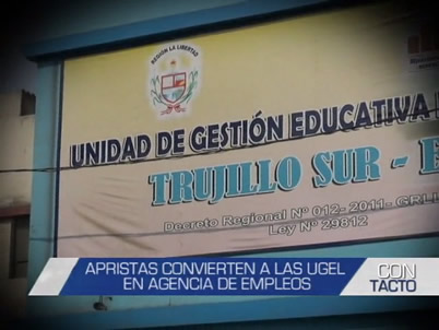 Las UGEL se convierten en agencias de empleo de militantes apristas. Compañeros copan puestos estratégicos en unidades de gestión educativa local de Trujillo. Conozca con nombres y apellidos la relación de apristas privilegiados que ingresaron a laborar sin gozar de experiencia profesional.