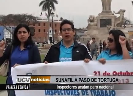 Los inspectores del Ministerio de Trabajo acataron un paro indefinido con el objetivo de que la ministra, Nancy Laos, cumpla con la implementación de la Superintendencia Nacional de Fiscalización Laboral (SUNAFIL), que incluye la nivelación en sus remuneraciones. Además piden que el Congreso interpele a la máxima funcionaria de dicho ministerio.