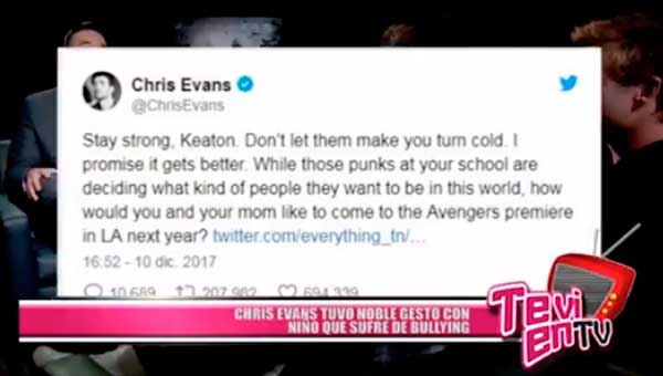 «Mantente fuerte, Keaton. No dejes que te enfríen. Te prometo que todo estará mejor», twitteó. Pero el mensaje de Evans, no solo alentaba al pequeño a seguir adelante pese a la difícil situación de bullying que vivía en su escuela, sino que incluía una invitación que más de uno envidiaría.