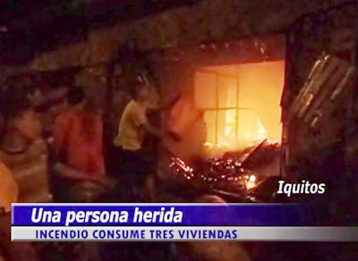Un incendio consumió tres viviendas, que funcionaban como locales de venta de madera, en la cuadra 3 de la avenida Navarro Cauper, en Iquitos, región Loreto.