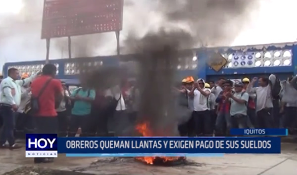 en Iquitos, más de 80 obreros de construcción civil que realizaban trabajos en un colegio, paralizaron sus labores y quemaron llantas para exigir el pago de sus haberes.