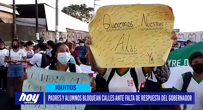 Padres de familia y también alumnos del Colegio Rosa Agustina Donayre de Morey de la ciudad de Iquitos, bloquearon una avenida principal de esta ciudad como medida de lucha ante la falta de respuesta del gobernador regional de Loreto sobre la culminación de la obra de la infraestructura de este colegio.
