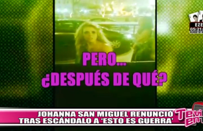 Tras haber sido denunciada por el ciudadano Jorge Bustamante, quien la acusó, ante testigos, de haberle reventado un vaso en la cabeza luego de una discusión en la fiesta del diseñador Efraín Salas, la conductora Johanna San Miguel «dió un paso al costado» en el reality «Esto es Guerra», así lo anunció su compañero Mathías Brivio.