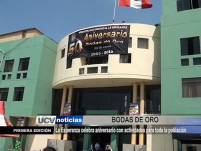 La Municipalidad Distrital de La Esperanza celebra su 50 aniversario y por sus bodas de oro viene realizando diversas actividades, como una feria gastronómica y un matrimonio civil comunitario en la Plaza de Armas del distrito.
