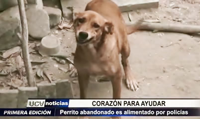 En el distrito de La Esperanza, a espaldas de las instalaciones de la DIVINCRI Norte, agentes policiales alimentan a un perro abandonado, que vive en el patio trasero de una vivienda.