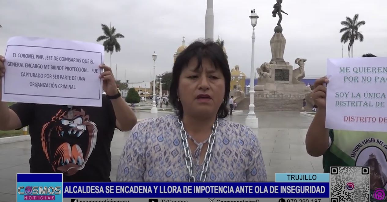 Encadenada y llena de impotencia, la alcaldesa distrital de Marmot, provincia de Gran Chimú, protestó para pedir la atención de las autoridades frente a la ola criminal en su jurisdicción. Denunció que sigue siendo amenazada por extorsionadores que le exigen 50 mil soles.