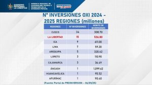 En el norte del país, La Libertad hace historia en este mecanismo y es la primera. En el ranking general, luego de Cusco y La Libertad, vienen las regiones de Ica (9 inversiones), Lima (7), Arequipa (5), Loreto (3), Cajamarca (3), Áncash (1), Huancavelica (1) y Apurímac (1).
