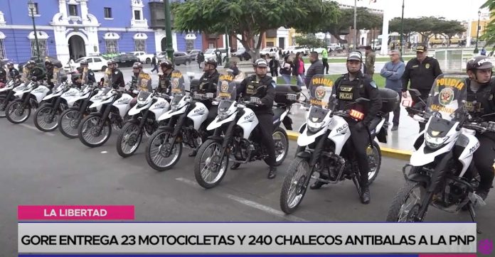 El Gobierno de La Libertad entregó 23 motos y más de 200 chalecos antibalas para la Policía Nacional. Con la presencia del ministro del Interior, se anunció la próxima adquisición de 144 camionetas para reforzar el patrullaje.