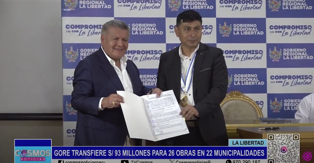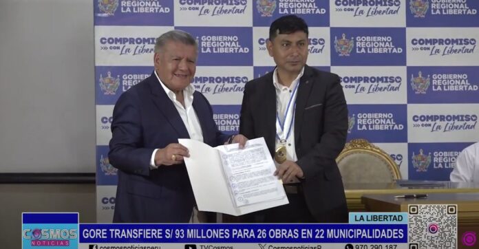 El Gobierno Regional de La Libertad transfiere 93 millones de soles a 22 municipalidades para construir 26 obras y se convierte en la primera región a nivel nacional en descentralizar recursos de su presupuesto a municipios para ejecutar obras públicas.
