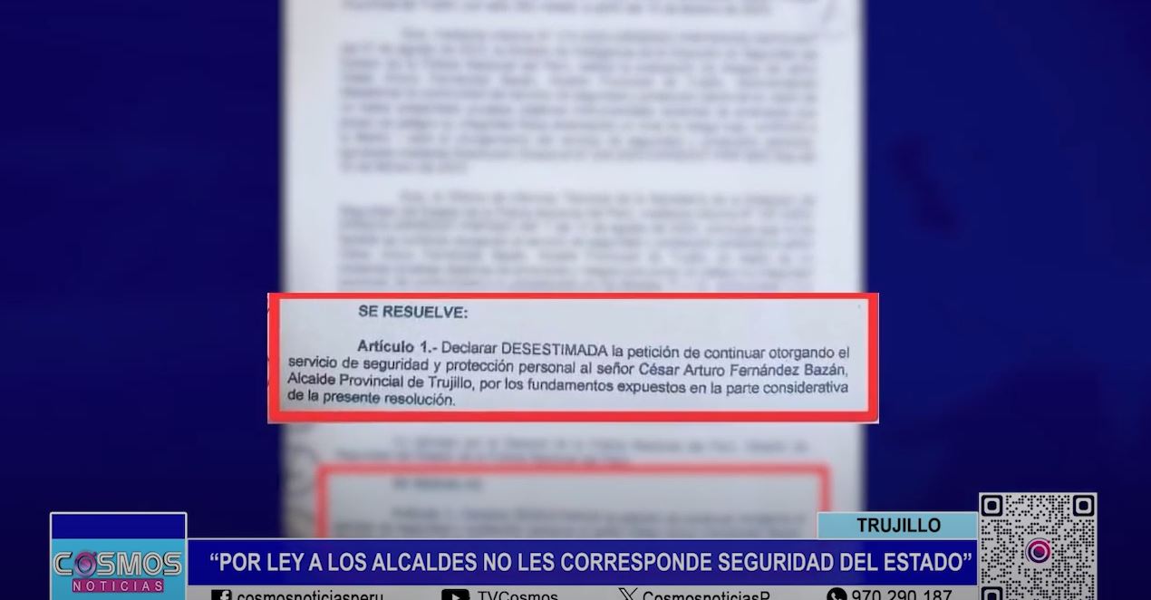 El Gral. Augusto Ríos, jefe de la Tercera Región Policial La Libertad, se pronunció sobre la negativa del Ministerio del Interior de brindarle protección del Estado al alcalde provincial de Trujillo, Arturo Fernández, señalando que tras directiva y por ley, a los alcaldes no les corresponde contar con Seguridad del Estado y que además según evaluación, no hay evidencias ni riesgo que presente la autoridad edil.