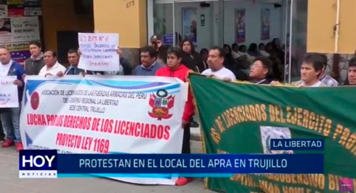 Licenciados del Ejército Peruano realizaron una protesta en el local del APRA en Trujillo. Ellos responsabilizaron a Jorge del Castillo, de intentar frenar el debate de la ley 1169 que otorga beneficios a los licenciados que participaron en el proceso de pacificación del país.