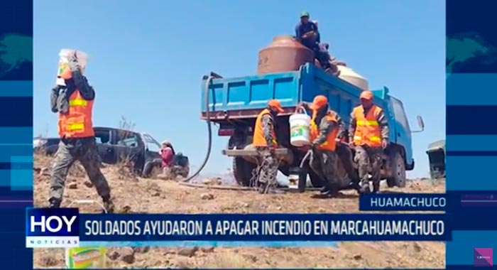 Integrantes del Batallón de Infantería Motorizado de Huamachuco, apoyaron la difícil tarea de sofocar un incendio forestal en la parte baja del complejo arqueológico Marcahuamucho en la provincia de Sánchez Carrión.