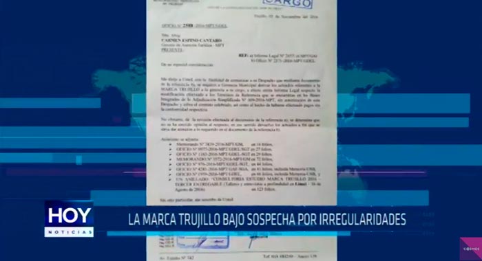 Hoy noticias accedió a documentos del año 2016 que revelan que en términos de referencia en el proceso para contratar a la empresa encargada de la elaboración de la marca Trujillo fueron cambiados, la licitación dio como ganador al consorcio integrado por una empresa de publicitas que habría asesorado la campaña de Elidio Espinoza.