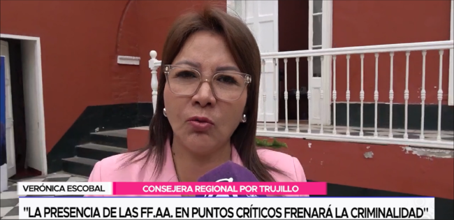 La consejera regional por la provincia de Trujillo, Verónica Escobal, respaldó la decisión del gobernador regional César Acuña sobre la urgencia de que 200 soldados del ejército salgan a patrullar la provincia de Trujillo y Virú ante la ola de crímenes que no cesa.