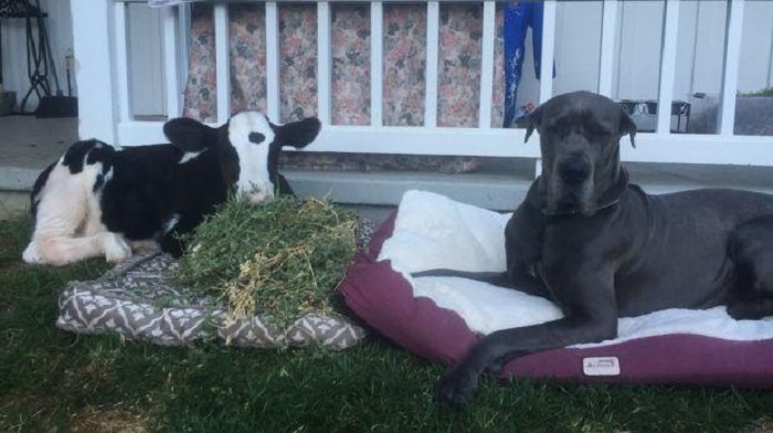 Goliath es una ternera convencida que es una perra; esta fue «criada» por Leonidas, un gran danés, esto sucedió luego de que la familia Hubbs la rescató del matadero hace casi dos meses y ahora comparte el sofá de una casa de rancho ubicada en Danville, California.