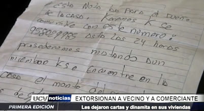 Continúan las extorsiones en Trujillo. Un vecino de Laredo denunció que extorsionadores le exigen diez mil soles para no atentar contra su vida. Lo mismo ocurre con una comerciante de El Porvenir, a quien le dejaron cartuchos de dinamita en su vivienda.