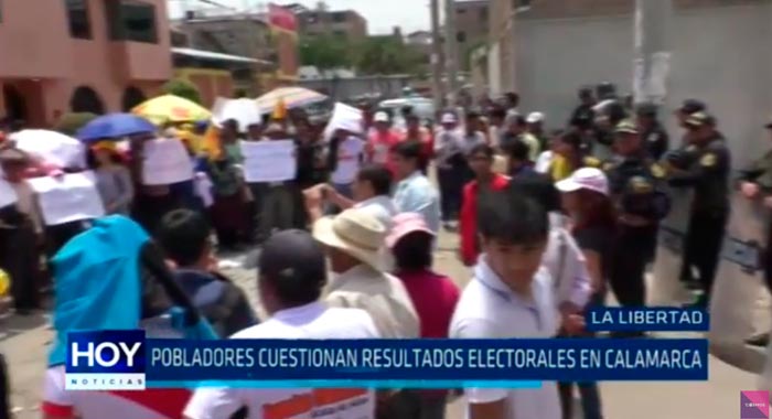 Decenas de pobladores del distrito de Calamarca, en Julcán, protestaron en la ODPE de Trujillo y se niegan a reconocer los resultados de la ONPE que en este distrito dan como ganador de los comicios al candidato de Restauración Nacional. Los manifestantes también denuncian fraude.