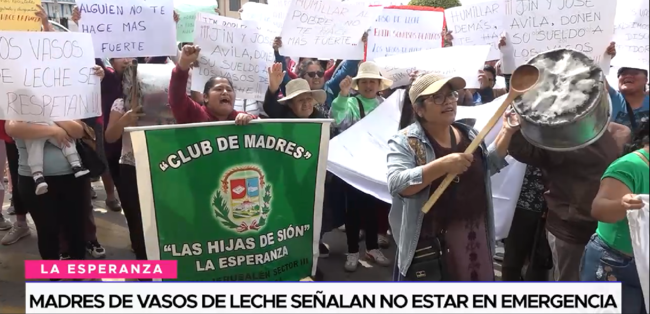 Integrantes de diferentes comités de base del vaso de leche del distrito de La Esperanza llegaron hasta los exteriores de la municipalidad para realizar un plantón y pedir a los regidores Jin Robles y José Ávila se retracten por una información brindada en la que aseguran que estas organizaciones se encuentran en estado de emergencia.