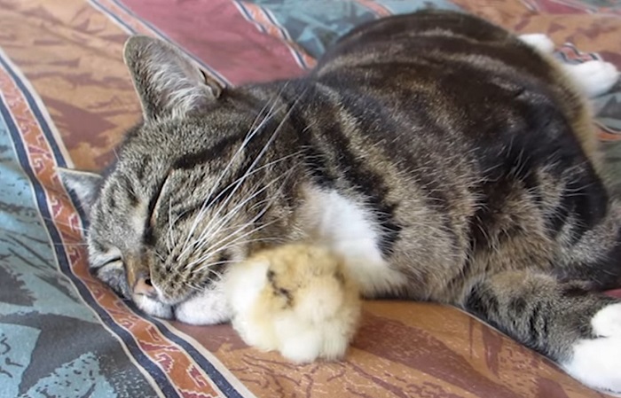 Todo el mundo le encanta abrazar a un gatito cálido y difuso, y este pollito no es la excepción. Él encuentra un buen lugar acogedor justo debajo de la barbilla peluda de este gato y decide acurrucarse.