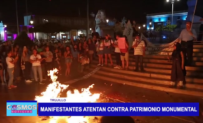 La Municipalidad Provincial de Trujillo, a través de la gerencia del proyecto especial del patrimonio monumental, denunció públicamente un daño irreparable contra el patrimonio monumental e histórico de la ciudad y del país, y es que un grupo de manifestantes habría pintado y quemado parte del mármol de la Plaza Mayor de Trujillo.