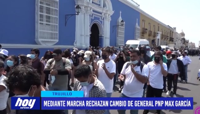 Decenas de trabajadores de las diversas áreas de la Municipalidad de Trujillo acompañados de ciudadanos de a pie, realizaron una marcha en el centro de Trujillo con la finalidad de ser escuchados por el ministro del Interior y el presidente Pedro Castillo con respecto al cambio del General Max García como jefe de la III Macro Región Policial De La Libertad. Según indicó la teniente alcaldesa Sandra Trujillo, el trabajo que estuvo realizando la autoridad en este mes fue positivo y debido a ello no quieren que sea cambiado a otra jurisdicción.