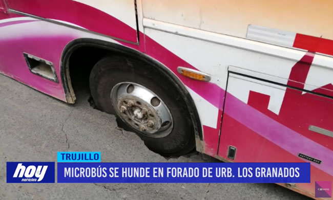 Este panorama ya se ha hecho parte de la vida cotidiana en Trujillo. En esta oportunidad en la urbanización Los Granados, este microbús de transporte urbano de la empresa “Señor de Los Milagros”, se hundió en este agujero, producto del ciclo de vida que ya cumplió el sistema de desagüe en la zona.