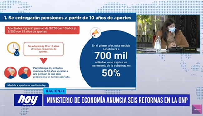 La ministra María Antonieta Alva indicó que la primera medida permitirá a personas con 65 años de edad acceder a una pensión con tan solo 10 años de aporte.