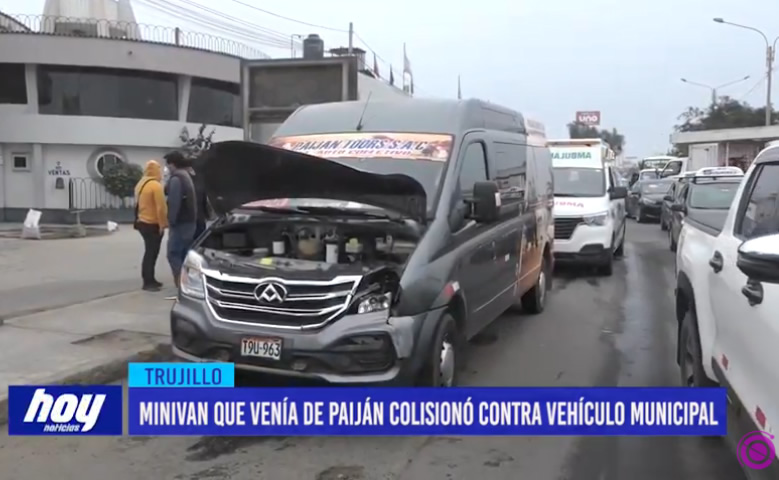 Esta minivan de la empresa de transportes «Paiján Toors S.A.C.» colisionó con un vehículo de la Municipalidad Provincial de Trujillo. Al parecer el accidente se produjo por la excesiva velocidad a la que iba el conductor de la unidad de transporte público.