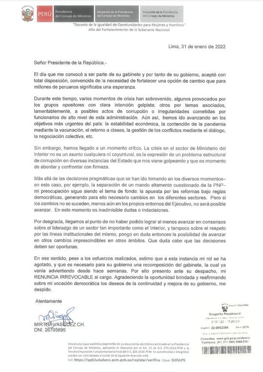 El silencio del presidente Pedro Castillo ante la renuncia de Guillén, ocurrida el pasado 28 de enero, habría complicado la situación del Consejo de Ministros y sobre todo para que Mirtha Vásquez, quien desde un inicio respaldó a Guillén cuando asumió el cargo de Interior desde noviembre, tomó la decisión de presentar su renuncia irrevocable a la presidencia del Consejo de Ministros, mediante una carta, en donde detalla lo siguiente: