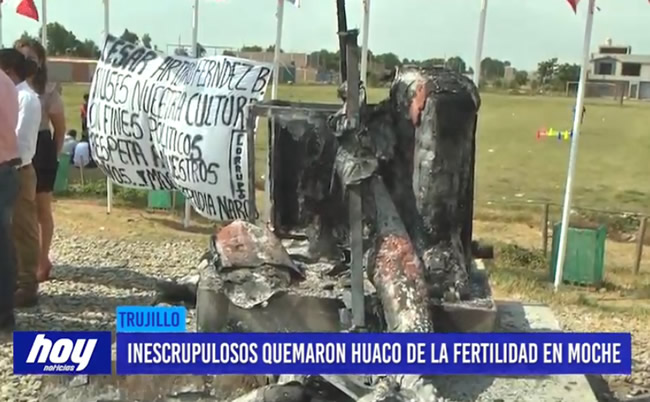 El huaco de la fertilidad fue quemado por sujetos desconocidos, según indicó el alcalde de Moche, los delincuentes habrían sido seis personas, quienes amenazaron con armas de fuego a las personas que cuidaban el lugar.