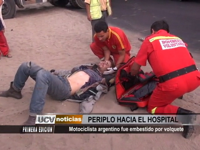 Un joven turista que viajaba con dirección al sur en plena carretera Panamericana, a la altura del paradero 15 de Alto Salaverry, fue embestido por un volquete. El joven sobrevivió de milagro al accidente, pero mostró serias fracturas en el brazo izquierdo.