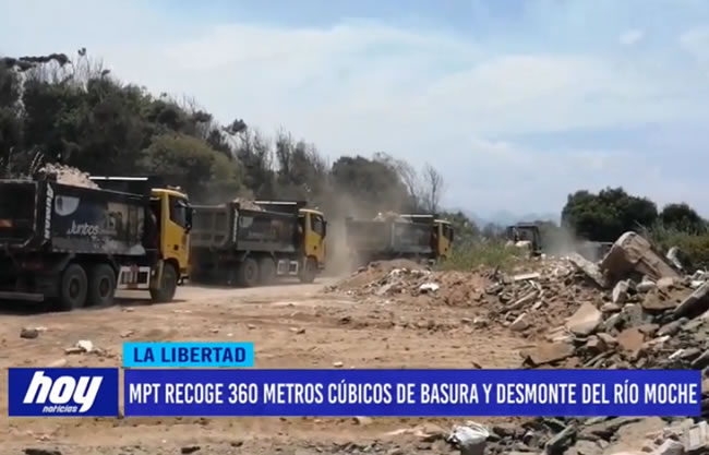 A raíz de la ampliación por 60 días del estado de emergencia por peligro inminente ante contaminación de las aguas superficiales del río Moche, personal de la Municipalidad Provincial de Trujillo retiró un total de 360 metros cúbicos de basura y desmonte del margen derecho del río Moche, el último fin de semana, el mismo que venía siendo utilizado como botadero por parte de personas inescrupulosas sin sentido común y sin conciencia ambiental.