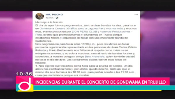 Así también, dimos de manifiesto el comunicado emitido por MR. PUCHO sobre lo sucedido en el concierto de Gondwana en Trujillo y el pronunciamiento de Mariano Palacios, integrante de la agrupación nacional de reggae Laguna Pai.