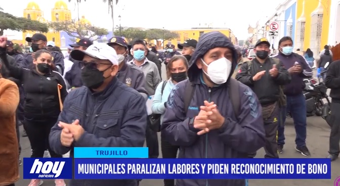 Los trabajadores de la comuna provincial de Trujillo paralizaron sus labores y realizaron un plantón en el frontis del palacio municipal para pedir que se les reconozca un bono por los conceptos de movilidad y refrigerio.