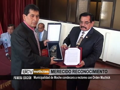 El alcalde de la Municipalidad Distrital de Moche condecoró con la Orden Muchik al presidente de la Asamblea Nacional de Rectores y rector de la Universidad Nacional de Ica por sus aportes a la educación y a la cultura.