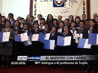 La Municipalidad Provincial de Trujillo reconoció a 45 docentes de la ciudad en el marco de la celebración por el Día del Maestro. La teniente alcaldesa de la ciudad, Gloria Montenegro, sostiene que esta fecha sirve para reflexionar en lo poco que el Gobierno Central invierte en educación y lo mucho que este sector necesita de aliento económico.