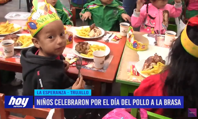 Con motivo del día del «Pollo a la brasa», por noveno año consecutivo, el Ministerio de Agricultura y Riego (Minagri) y la Asociación Peruana de Avicultura (APA) adelantaron las celebraciones y agasajaron a unos 150 niños de la institución educativa N° 1680 divina misericordia del distrito de La Esperanza, como antesala al día central que se celebra el tercer domingo del mes de julio.