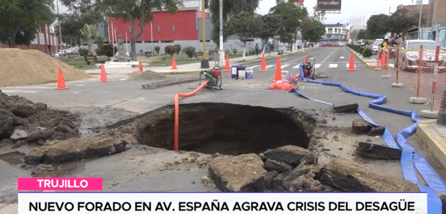 La crisis del sistema de desagüe sigue haciendo estragos en las calles de la ciudad. Un nuevo forado se ha formado en plena avenida España, una de las vías más transitadas, justo frente al supermercado Plaza Vea y al colegio Antonio Raimondi. El hecho se registró el último sábado, mostrando el gran hueco en la pista, causando tráfico lento, agentes de tránsito desviando vehículos.