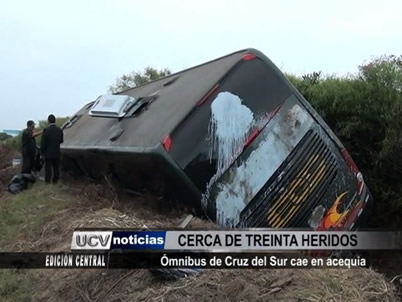 Cerca de 30 heridos dejó el despiste y vuelco de un ómnibus de la empresa de transportes Cruz del Sur en la Vía de Evitamiento en el distrito de Víctor Larco.