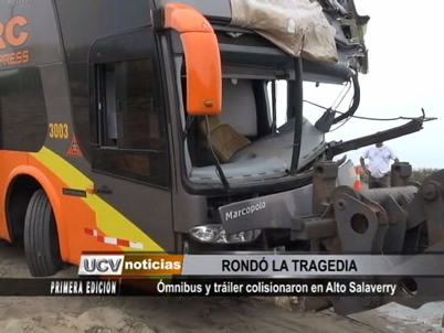 Un ómnibus interprovincial con 35 pasajeros y un tráiler que transportaba pescado, chocaron aparatosamente en el sector Alto Salaverry. Producto de la colisión, el conductor de la unidad de servicio público resultó gravemente herido.