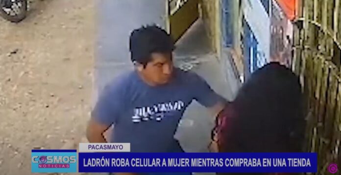 Un sujeto vestido con polo, short y sandalias aparece en la escena y se coloca detrás de la mujer simulando ser otro comprador. En un rápido accionar, el delincuente le arrebata el celular y corre hacia la pista para luego subirse a un mototaxi y emprender la fuga.