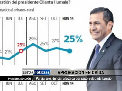 Las revelaciones sobre el caso Belaúnde Lossio, afectaron la imagen de la pareja presidencial. Así lo revela la última encuesta urbana de Ipsos, donde el mandatario obtiene 25% de aprobación.