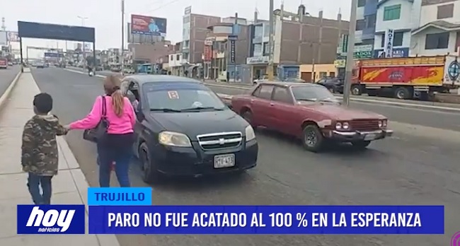 En el distrito de La Esperanza, el paro indefinido de transportistas no fue acatado al 100 %. Taxis, colectivos, mototaxis circularon con total normalidad, a excepción de microbuses que por precaución ninguna línea circuló este lunes.