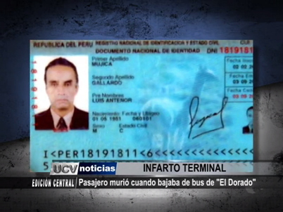 Un pasajero que venía de Lima a Trujillo en un bus de la empresa “El Dorado” murió cuando descendía del vehículo en el terminal terrestre de la avenida América. Un infarto habría originado la muerte instantánea del infortunado hombre.
