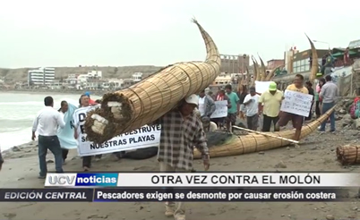 La Asociación de Pescadores Huanchaqueros realizó una marcha en pleno balneario, exigiendo la destrucción total del molón de Salaverry, que en su opinión es el que origina el problema de la erosión costera.