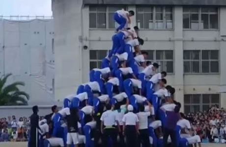 Estudiantes de un colegio de secundaria de la ciudad de Yao City, en Japón, realizaron una pirámide humana pero desafortunadamente no salió del todo bien y seis alumnos terminaron lastimados; en el video se aprecia que los jóvenes realizaron una impresionante pirámide humana de nueve niveles.