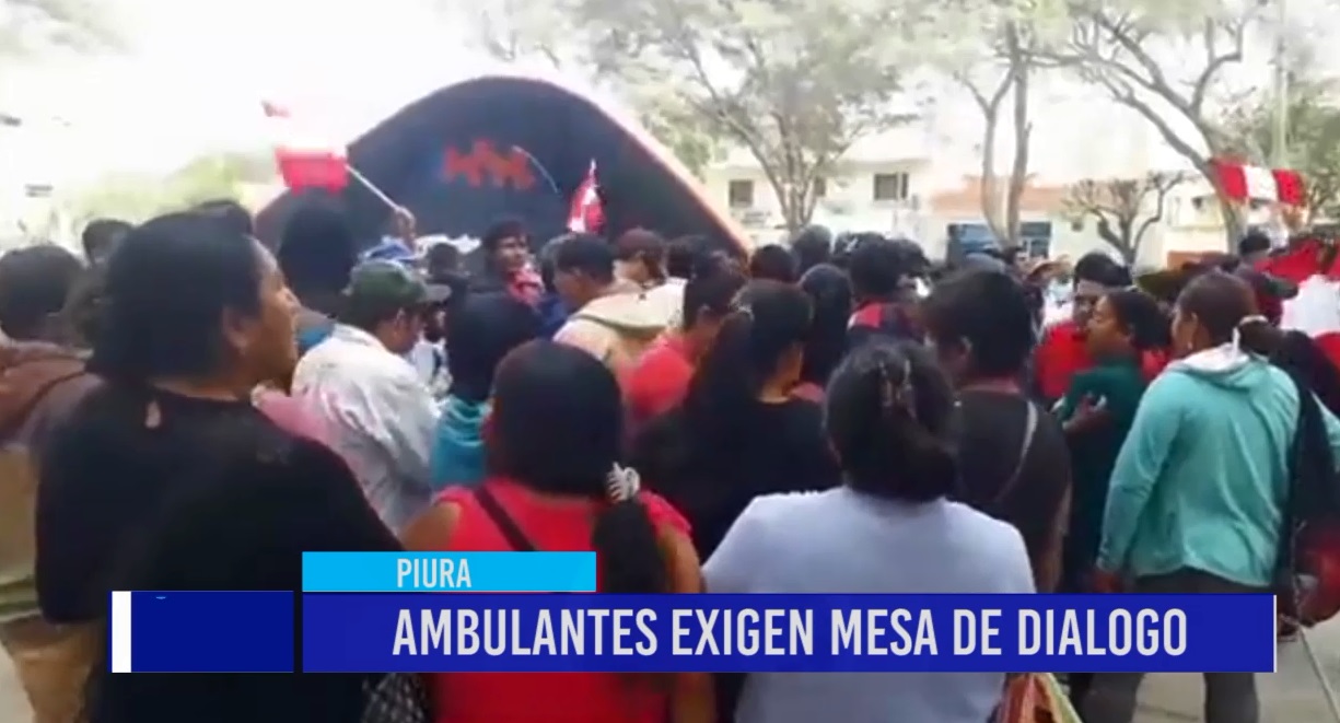 Los ambulantes que fueron retirados de las principales vías del mercado central de Piura realizaron una manifestación en el parque infantil Miguel Cortez exigiendo se les permita regresar al comercio ambulatorio indicando que es su única fuente de ingreso.