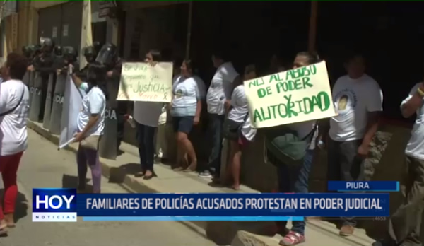 En Piura, familiares de los 14 policías acusados de integrar el Escuadrón de la Muerte protestaron en los exteriores de la sede judicial donde se desarrolló la audiencia de prisión preventiva.