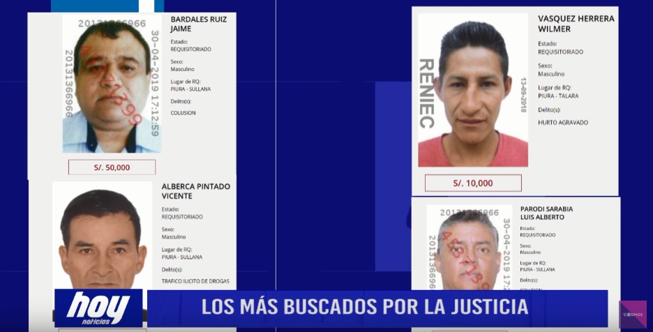 04 piuranos aparecen en la lista del Programa de Recompensas del Ministerio del Interior, el ex alcalde de Sullana, Jaime Bardales Ruiz y el ex funcionario municipal, Luis Alberto Parodi Saravia figuran en dicha lista.